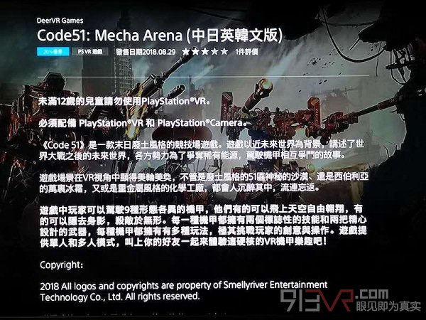 最近聽聞一款國(guó)產(chǎn)精品VR游戲強(qiáng)勢(shì)登陸了PSVR港服,于是我馬上就體驗(yàn)了一下。這款游戲就是由第一摩碼娛樂(lè)制作的、VRCORE發(fā)行的《Code51: Mecha Arena》,目前在港服的價(jià)格是158港幣,截止發(fā)稿日還享有八折優(yōu)惠。