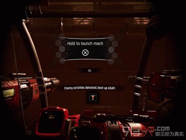 教學(xué)關(guān)卡開始于一個(gè)機(jī)庫(kù),長(zhǎng)按X鍵即可啟動(dòng)機(jī)甲。這里需要說(shuō)明一下,雖然目前港服的版本是英文語(yǔ)言,但對(duì)于玩家來(lái)說(shuō)影響并不大,因?yàn)楸咀鳟吘故且豢钪鞔驅(qū)?zhàn)的機(jī)甲游戲,并沒有太過(guò)復(fù)雜的劇情部分。