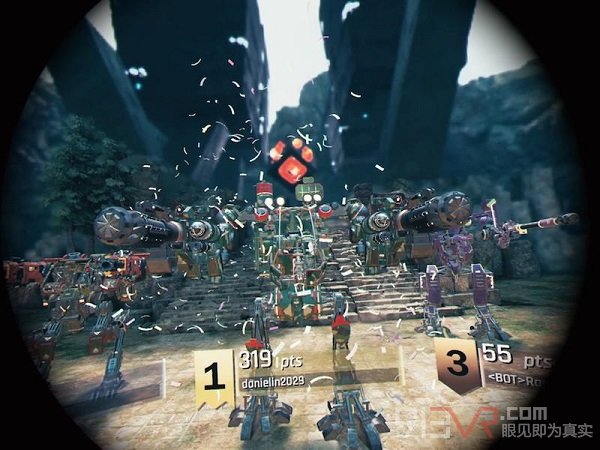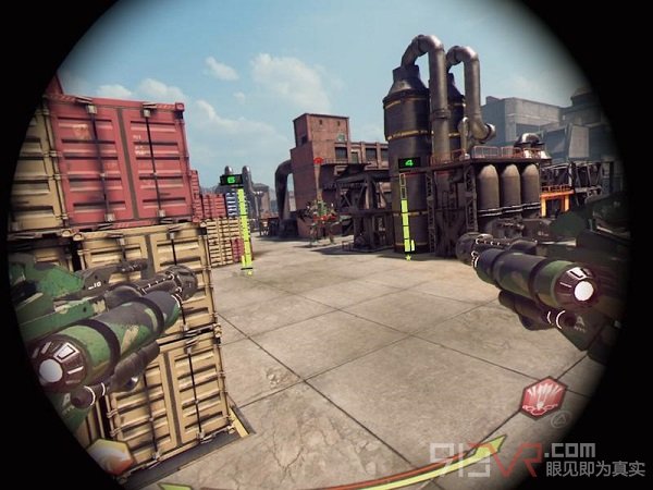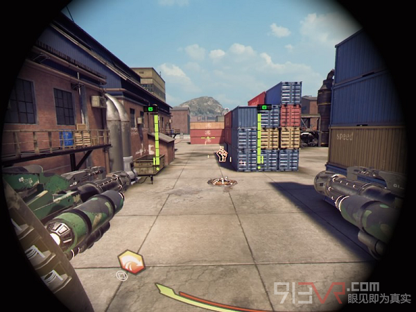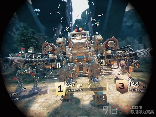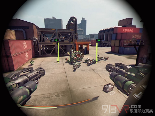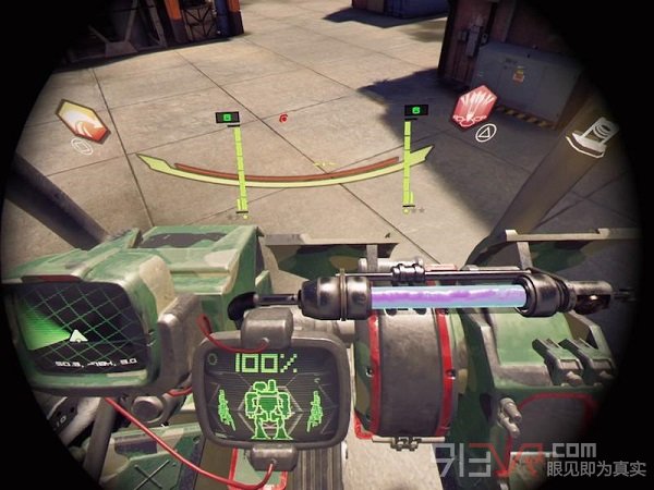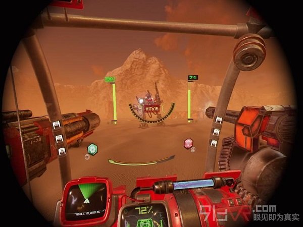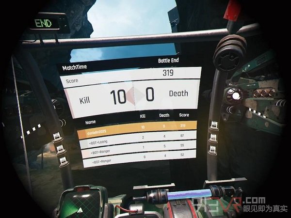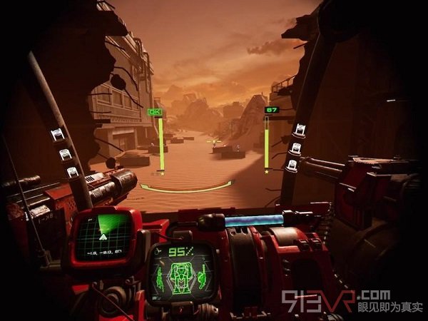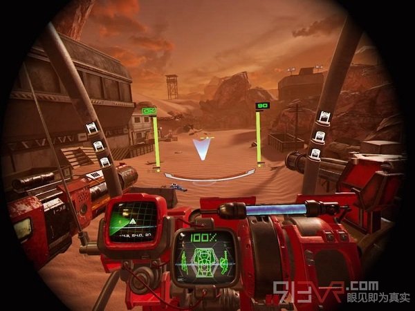 進(jìn)入練習(xí)模式,系統(tǒng)隨機(jī)分配了一張地圖和3名NPC玩家(包括玩家一共4名)。在地圖中移動(dòng)我并沒有感到一絲眩暈,這一方面或許與我玩VR游戲比較多有關(guān),另一方面也是因?yàn)橥婕移鋵?shí)是在機(jī)甲框體里進(jìn)行操作。雖然玩家看外面的地圖是在移動(dòng),但對(duì)于框體來(lái)說(shuō)是靜止的,這種設(shè)計(jì)也在一定程度上減少了眩暈感的產(chǎn)生。