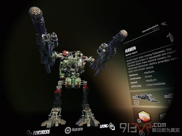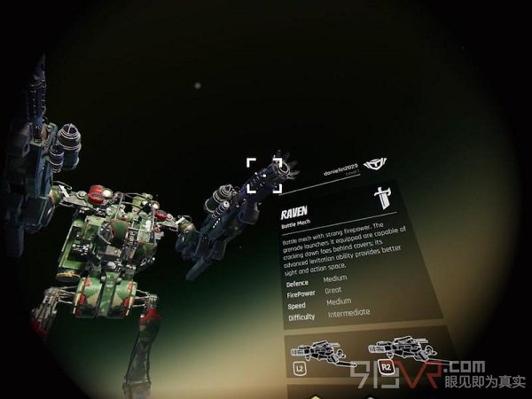 之后我選擇了練習(xí)模式也就是人機(jī)對(duì)戰(zhàn)的模式,在進(jìn)入戰(zhàn)斗之前,首先需要選擇機(jī)甲,看到一臺(tái)臺(tái)霸氣的機(jī)甲,我心中不由得感慨制作團(tuán)隊(duì)的用心。對(duì)于每一種機(jī)甲,玩家都可以旋轉(zhuǎn)查看其機(jī)身模型,同時(shí)在其右側(cè)還有關(guān)于機(jī)甲本身及其武器、技能的具體介紹。此時(shí)按下扳機(jī)鍵,查看的機(jī)甲模型還可以進(jìn)行射擊,讓人迫不及待的想要趕緊加入戰(zhàn)斗。