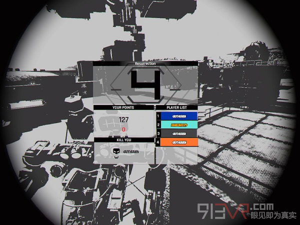 有勝就有負(fù),一不小心,被敵人干掉了!畫面馬上變成黑白色,然后等待讀秒復(fù)活,同時(shí)系統(tǒng)也顯示出了本局目前各玩家的分?jǐn)?shù)排名。