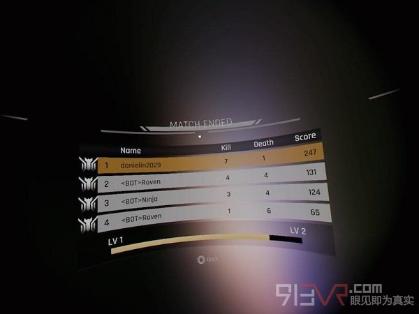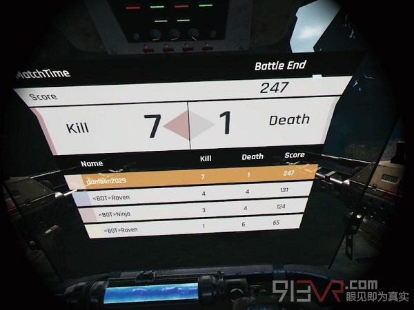 經(jīng)過(guò)了第一局的被虐(排名墊底),到第二局的時(shí)候我已經(jīng)確定了自己的打法(那就是猥瑣流),結(jié)果成績(jī)果然不錯(cuò)——7殺1死,排名第一!一局游戲結(jié)束后,系統(tǒng)首先會(huì)顯示當(dāng)前玩家及其他玩家(NPC)的成績(jī)。