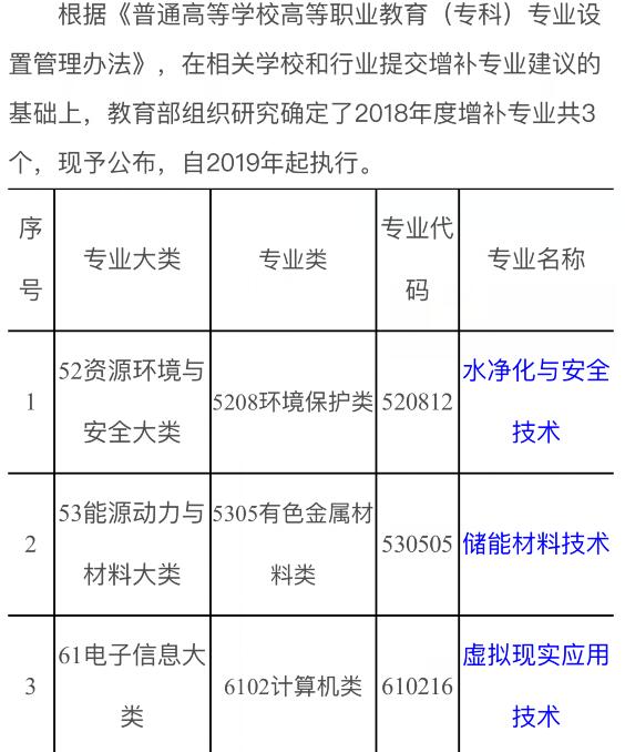 此次新增的3個專業(yè)分別為虛擬現(xiàn)實應(yīng)用技術(shù)、水凈化與安全技術(shù)、儲能材料技術(shù)。