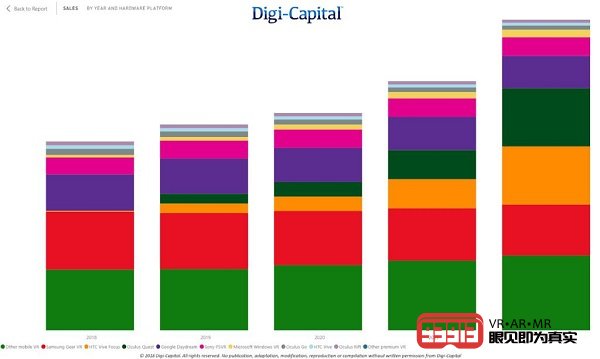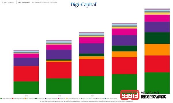 Digi-Capital預測隨著Oculus Quest VR一體機的發(fā)布,基于設備銷售的數據,附件率和損耗率,VR在所有平臺(主機,PC,移動設備,VR一體機)上的總安裝基數(即活動單元,而非銷售額) )到2022年底在全球范圍內將達到5000萬臺。