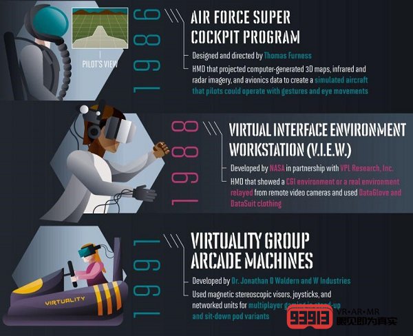 第一款頭戴式顯示器(HMD)是由Morton Heilig在1960年開發(fā)的Telesphere Mask。使用立體技術(shù),3D圖像,寬屏視覺和立體聲來創(chuàng)造其體驗(yàn)。1986年,空軍超級(jí)駕駛艙計(jì)劃由Thomas Furness設(shè)計(jì)和指導(dǎo),并使用HMD投影計(jì)算機(jī)生成的3D地圖和圖像,以模擬飛機(jī)并幫助訓(xùn)練飛行員。