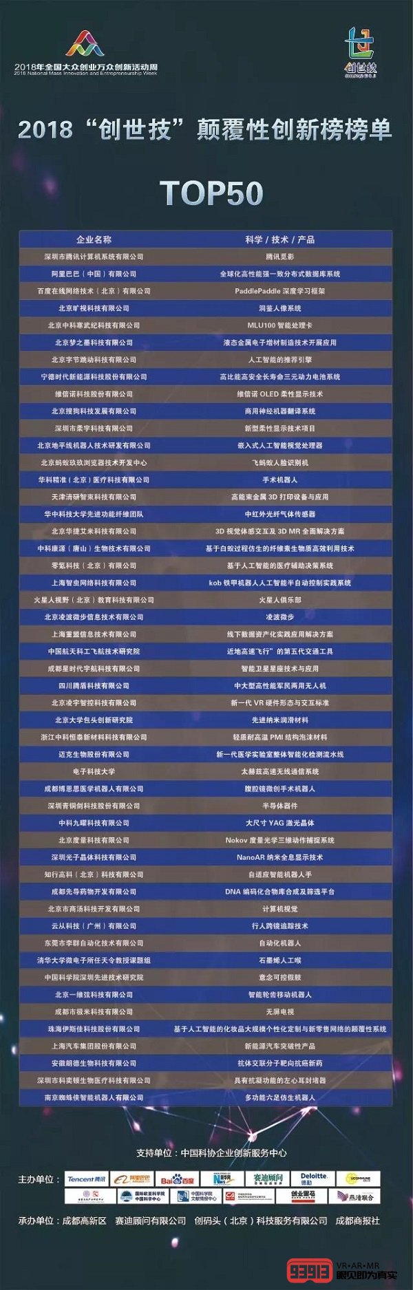 在成都主會場——2018“創(chuàng)世技”顛覆性創(chuàng)新榜發(fā)布會上,對外正式發(fā)布了全國范圍內(nèi)首張顛覆性創(chuàng)新榜單TOP50,作為移動VR/AR交互領域全球領先的創(chuàng)新企業(yè)NOLO VR(北京凌宇智控科技有限公司),從申報的2000余個項目中脫穎而出,成為國內(nèi)唯一一家上榜的VR/AR交互科技創(chuàng)新企業(yè),榮獲2018顛覆性創(chuàng)新榜50強獎,與百度、騰訊、阿里巴巴、曠視科技、商湯科技等50家企業(yè)共同入選,成為國內(nèi)第一批帶有顛覆性創(chuàng)新標簽企業(yè)。