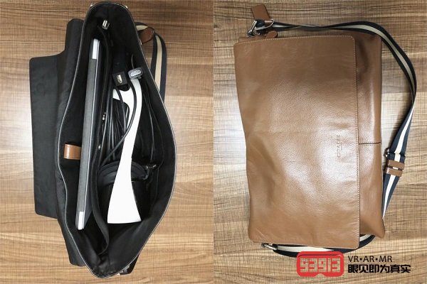 隨手找來(lái)了個(gè)單肩包,電腦和E3都可以輕松的裝進(jìn)去,而且VR頭盔只有315克,比超極本還輕。