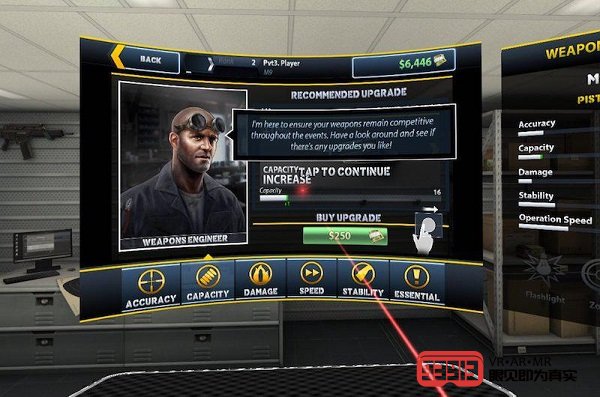 此時(shí)一位酷酷的大叔(有點(diǎn)像杰森斯坦森)出現(xiàn)了,原來他在大地圖中的裝備商店(UPGRADE STORE)工作,玩家如果需要升級(jí)手上的槍械,就可以找他。進(jìn)入裝備商店,我發(fā)現(xiàn)這里提供了槍械各項(xiàng)功能的升級(jí)服務(wù)(準(zhǔn)確性、彈藥量、傷害、速度、穩(wěn)定性、配件),不過想要升級(jí)槍械,還是需要花錢的。