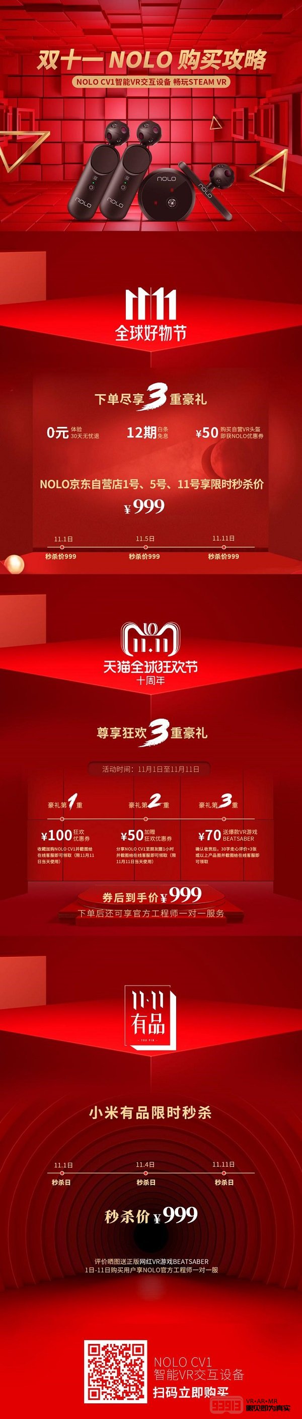 11月1日,NOLO 在京東、天貓、小米有品三大電商平臺全面開啟促銷活動?;顒悠陂g,NOLO京東自營旗艦店推出1號、5號、11號限時秒殺價999元(原價1299),用戶購買NOLO京東自營VR頭盔,即可獲得50元NOLO優(yōu)惠券,還可盡享“0元體驗,30天無憂退”服務。