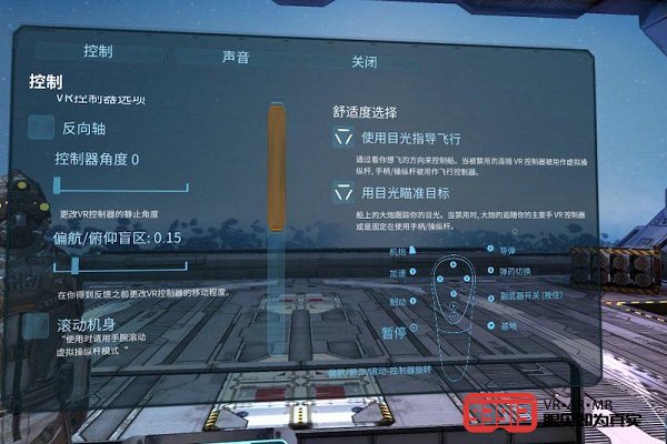 值得一提的是,本作的操作還是比較復雜的。進入設置菜單,玩家可以查看本作的控制選項并進行詳細的配置。作為一款空戰(zhàn)模擬游戲,本作的控制鍵位自然少不了,而為了彌補VR一體機手柄按鍵較少的不足,本作可以說是在觸摸板的鍵位上下足了功夫,觸摸板的四個方向都有對應的鍵位。如此之多的控制鍵位,就要求玩家在教程及之后的實戰(zhàn)中多多練習,這樣才能應付節(jié)奏越來越快的戰(zhàn)斗。