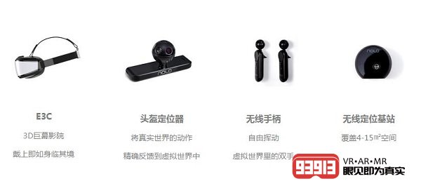 大朋VR E3C 輕享運動套件包含E3C巨幕影院(即VR頭盔)、頭盔定位器、游戲手柄、和無線定位基站。
