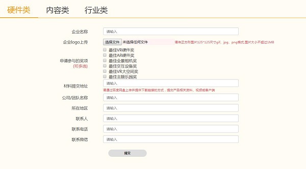 在官網(wǎng)參選報(bào)名欄填寫詳細(xì)報(bào)名資料,報(bào)名共分為硬件、內(nèi)容、行業(yè)類,勾選你所要參加的類別的申請(qǐng)獎(jiǎng)項(xiàng)(可多選),(例如內(nèi)容類-最佳VR游戲獎(jiǎng)),填寫正確無誤后點(diǎn)擊提交按鈕即報(bào)名成功。