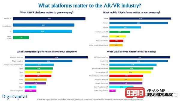 VR公司關注的平臺分布是HTC Vive / Focus / Pro(73%)和Oculus Rift(70%),其次是Oculus Go(57%),Microsoft Windows VR(53%),Samsung Gear VR(50%)。Oculus Quest雖然沒有上市但41%的受訪者已經專注于該平臺。鑒于行業(yè)對Oculus Connect 5發(fā)布的反應,可以合理地假設Oculus Quest在隨后的調查中可以顯著提高指數。提到的其他VR平臺包括Pico,Web VR,聯想Mirage和StarVR。
