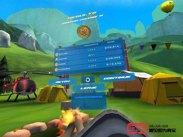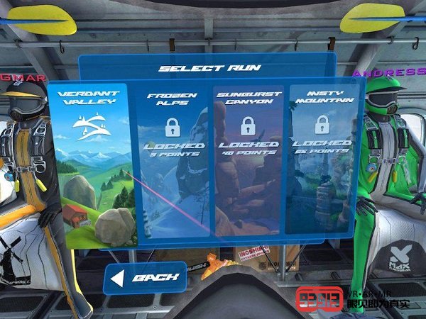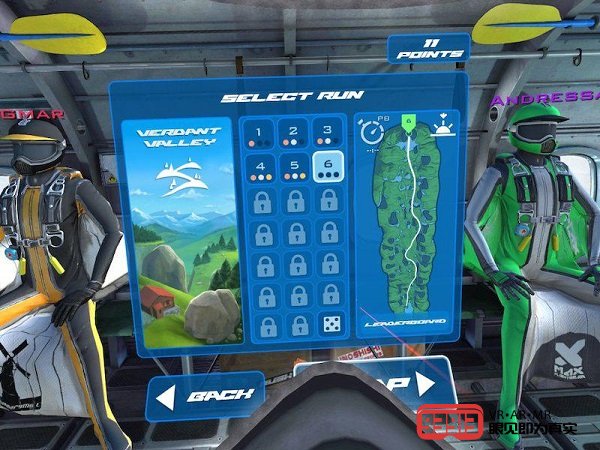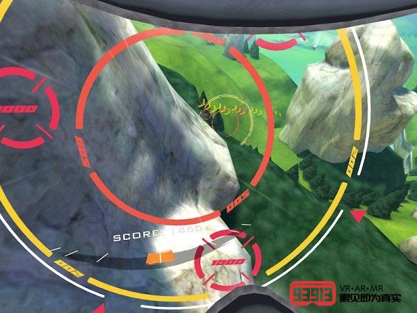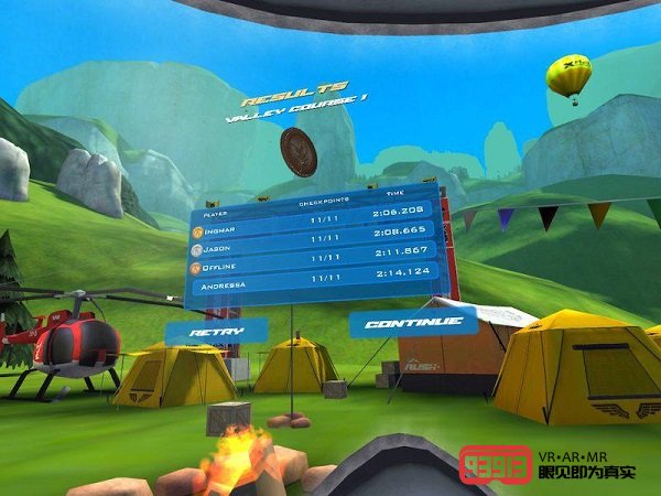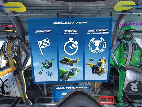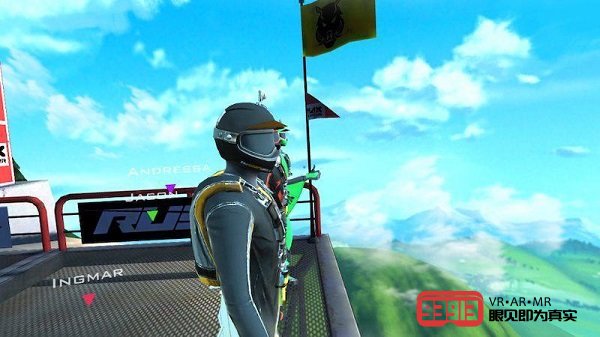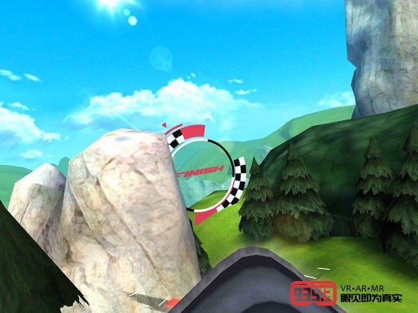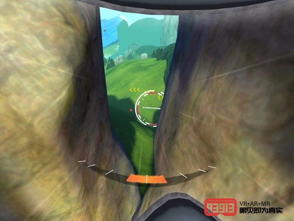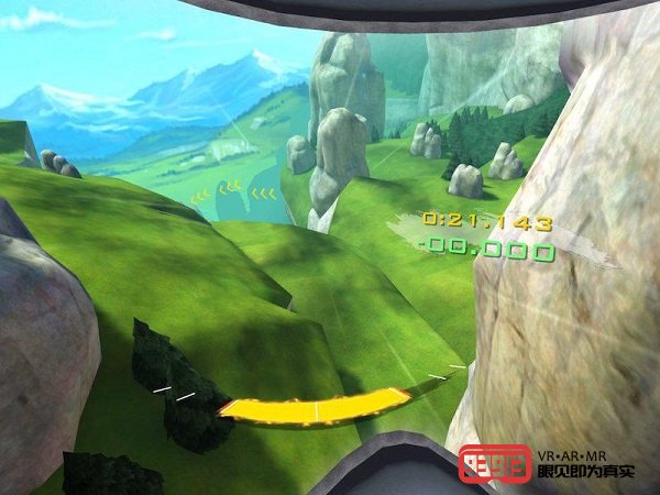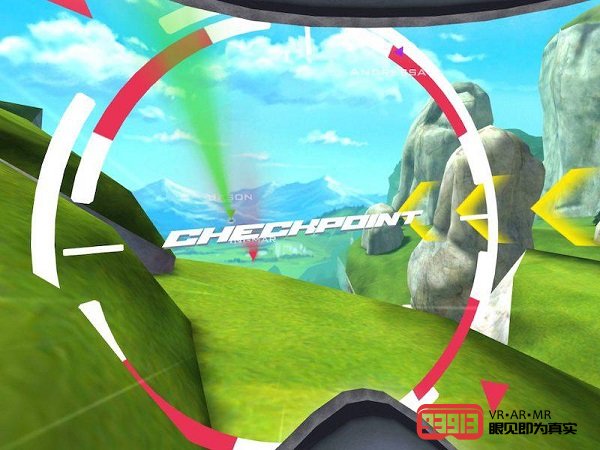隨著倒計(jì)時(shí)和出發(fā)的信號(hào),我和其余三名NPC選手已經(jīng)飛行在空中。話說回來,第一次用VR玩這種飛行模擬游戲,我心里一方面很興奮,一方面也很緊張。游戲的基本玩法是沿著比賽路線向下飛行,而途中會(huì)有多個(gè)checkpoint,玩家需要按照順序穿過一個(gè)又一個(gè)checkpoint,同時(shí)注意不要撞在山崖或地面上,不然就會(huì)game over。