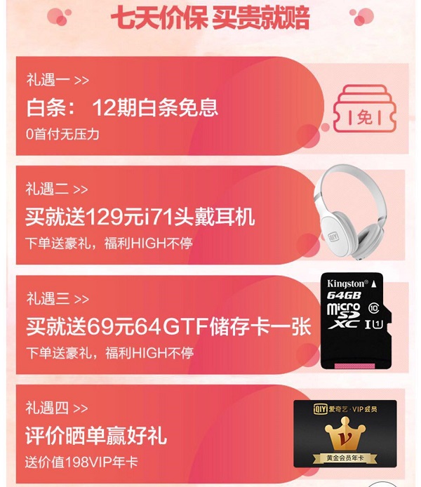 你以為這就結束了嗎?當然不會這么簡單!活動期間下單愛奇藝奇遇2VR一體機的用戶,即可獲得價值129元的愛奇藝i7藍牙耳機、69元的TF卡等多重好禮,評價曬單更有機會免費享受價值198元的愛奇藝VIP年卡福利。