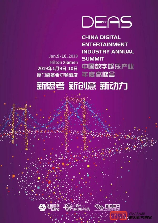 在廈門市人民政府指導下,2018中國數(shù)字娛樂產(chǎn)業(yè)年度高峰會(DEAS)由移動游戲企業(yè)家聯(lián)盟(MGEA)和廈門市思明區(qū)人民政府主辦,上海漢威信恒展覽有限公司聯(lián)合主辦,并得到了廈門市文發(fā)辦、廈門市經(jīng)信局和廈門市思明區(qū)科信局的大力支持。本屆DEAS以“新思考 新創(chuàng)意 新動力”為主題,將傾情回顧2018年數(shù)字娛樂產(chǎn)業(yè)發(fā)展態(tài)勢;精心盤點數(shù)字娛樂產(chǎn)業(yè)熱點;深入解讀數(shù)字娛樂產(chǎn)業(yè)現(xiàn)象;權(quán)威預(yù)測2019年數(shù)字娛樂產(chǎn)業(yè)全新發(fā)展動向。