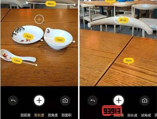 我們先來體驗一下測長度,通過“+”來確定被測物體的兩點,屏幕上即刻出現(xiàn)長度數(shù)據(jù),如果用戶想要同時測量多個物體的長度,只需要基于不同的物體來確定不同的兩點即可,測量物體的長寬高皆可使用這個功能,非常實用簡單。