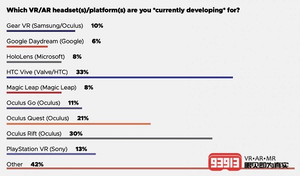 根據(jù)報告顯示Vive繼續(xù)引起開發(fā)人員的興趣。在今年的調(diào)查中“你在哪些平臺上開發(fā)游戲?”這個問題看到33%的VR / AR開發(fā)人員選擇HTC Vive(Valve / HTC),其次是Rift,為30%。此外,21%的VR / AR開發(fā)人員表示他們正在研究尚未發(fā)布的Oculus Quest。400美元Quest的開發(fā)者工具包不能公開發(fā)布,所以它是獨立VR系統(tǒng)推出前的一個值得注意的展示。