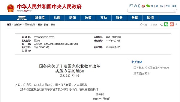 近日,國務(wù)院印發(fā)《國家職業(yè)教育改革實(shí)施方案》(以下簡稱《方案》)。