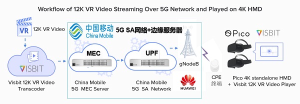 VR視頻是目前所有超大數(shù)據(jù)移動應(yīng)用中最難處理的一種,從傳輸?shù)讲シ?、再到顯示,中間任何一步在清晰度和性能上有所打折都會影響到最終用戶的體驗(yàn)。在本項(xiàng)目中,12K清晰度的VR視頻首先經(jīng)過Visbit 的智能沉浸云進(jìn)行特殊12K轉(zhuǎn)碼,再通過由浙江移動和華為公司共同搭建的5G SA網(wǎng)絡(luò)和邊緣計算服務(wù)器向VR頭顯設(shè)備進(jìn)行推流,Visbit VR視頻播放器收到推流后,運(yùn)用其專利的注視點(diǎn)渲染技術(shù),在Pico 最新一代4K屏VR一體機(jī)G2 4K上流暢解碼播放,讓終端用戶得以完美體驗(yàn)12K VR視頻令人驚艷的清晰度。
