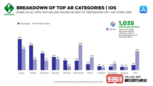 在iOS上,游戲占AR應(yīng)用下載量的25%,使得游戲成為平臺(tái)上最受歡迎的AR類別。
