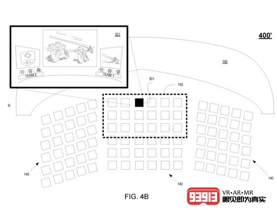 該專(zhuān)利還描述了讓VR用戶(hù)看到正在運(yùn)行的游戲內(nèi)部。想象一下,在觀眾中和在游戲中之間進(jìn)行切換。它還設(shè)想了混合模式,其中游戲元素出現(xiàn)在競(jìng)技場(chǎng)周?chē)奶摂M增強(qiáng)現(xiàn)實(shí)視圖中。