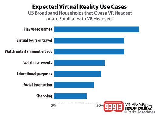 Parks Associates的一份新報(bào)告認(rèn)為,游戲仍然是VR頭顯的主要用途。在2017年至2018年間,消費(fèi)者對(duì)VR技術(shù)的熟悉度約占美國(guó)寬帶用戶的四分之一,其中游戲玩家最熟悉這項(xiàng)技術(shù)。在擁有或了解VR的消費(fèi)者中,54%的人將頭顯用于游戲。