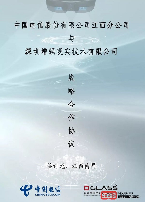 2019年3月20日,深圳增強(qiáng)現(xiàn)實(shí)技術(shù)有限公司(0glasses AR)與中國電信股份有限公司江西分公司簽訂戰(zhàn)略合作協(xié)議,雙方將運(yùn)用各自的優(yōu)勢,在江西智慧城市、智慧物聯(lián)等領(lǐng)域基于5G技術(shù)以及新一代智能信息技術(shù)的AI應(yīng)用展開合作,建立全面業(yè)務(wù)合作伙伴關(guān)系,共同打造智慧平臺建設(shè),促進(jìn)5G+AR/VR產(chǎn)業(yè)發(fā)展。