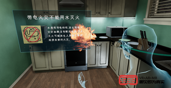 為了更好地理解這個(gè)項(xiàng)目,筆者在現(xiàn)場(chǎng)親自進(jìn)行了體驗(yàn)。之后的隨機(jī)采訪(fǎng)中發(fā)現(xiàn)大家的感受幾乎一致:有所收獲!——開(kāi)始時(shí),體驗(yàn)者置身于一個(gè)普通的家庭環(huán)境中。讓人意外又驚喜的是,體驗(yàn)者擁有極高的自由度,肢體動(dòng)作1:1精確映射到虛擬環(huán)境中:比如在室內(nèi)自由行走、靠近物體觀察細(xì)節(jié)、互相傳遞物品等……隨后,火情發(fā)生,體驗(yàn)者需要依靠自己的“努力”進(jìn)行救火。當(dāng)然,作為一個(gè)教育項(xiàng)目,系統(tǒng)會(huì)適時(shí)地給出一些正確提示。在項(xiàng)目的最后,體驗(yàn)者順利逃生!