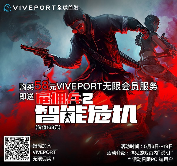 在國內(nèi)VR游戲圈,《雇傭兵》的名字可謂家喻戶曉,2016年橫空出世的VR射擊游戲《雇傭兵》更是紅遍了大江南北的VR線下體驗(yàn)店。這次我們體驗(yàn)的《雇傭兵2:智能危機(jī)》就是《雇傭兵》系列的最新作,之前已于四月在VIVEPORT平臺(tái)全球首發(fā)。說到這里不得不提的是,5月6-19日,凡購買58元VIVEPORT無限會(huì)員服務(wù)的用戶就能免費(fèi)獲得價(jià)值168元的《雇傭兵2:智能危機(jī)》,機(jī)會(huì)難得,不容錯(cuò)過!