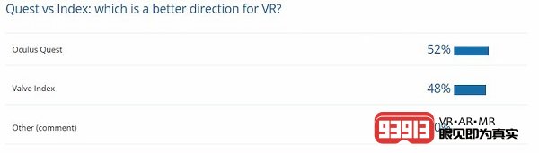 調(diào)查結(jié)果顯示兩者的受歡迎程度非常接近,52%的受訪者選擇了Oculus Quest,48%的受訪者選擇了Valve Index。