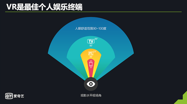 為什么說(shuō)VR將會(huì)是5G時(shí)代最重要的一塊屏?從理論上講,VR是體驗(yàn)最佳的個(gè)人娛樂(lè)終端。視頻是一種視覺(jué)藝術(shù),大部分人最直觀的體驗(yàn)就是屏幕越大、感受就越好??措娪氨瓤措娨暩杏X(jué)好,看電視比看手機(jī)感覺(jué)好,其實(shí)這里相對(duì)精準(zhǔn)的解釋就是關(guān)于視場(chǎng)角的概念。視場(chǎng)角越大,人的視網(wǎng)膜能夠接收的有效信息就越多。舉例來(lái)說(shuō),5.5寸手機(jī)對(duì)應(yīng)20多度視場(chǎng)角,15寸PC對(duì)應(yīng)30多度視場(chǎng)角,55寸電視對(duì)應(yīng)40多度視場(chǎng)角。對(duì)于人眼來(lái)說(shuō),舒適的觀影范圍是50至100度,在目前所有的觀影產(chǎn)品中VR具備這樣的條件。當(dāng)然有人說(shuō),電視可以越做越大,但是大尺寸的電視占地面積也大,需要的房間面積更大,除非是豪宅或別墅,否則一般人無(wú)法享受這樣的體驗(yàn)。因此,對(duì)于大眾消費(fèi)者而言,VR會(huì)是個(gè)人娛樂(lè)最好的終端選擇。