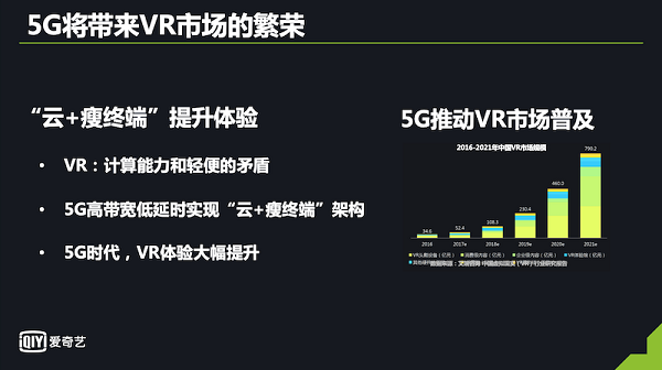 VR將如何發(fā)展?愛(ài)奇藝認(rèn)為,5G對(duì)于VR不是錦上添花,而是雪中送炭。從產(chǎn)品體驗(yàn)的角度來(lái)看,計(jì)算能力與產(chǎn)品設(shè)計(jì)永遠(yuǎn)存在一種矛盾。VR設(shè)備需要顯示全景360度的虛擬影像,對(duì)于圖形計(jì)算能力的要求非常高,這就需要強(qiáng)大的計(jì)算能力。但是當(dāng)芯片的計(jì)算能力強(qiáng)大之后,對(duì)于諸如散熱等方面的產(chǎn)品設(shè)計(jì)就提出了更高要求,必然會(huì)導(dǎo)致產(chǎn)品的輕薄化設(shè)計(jì)存在非常大的難度,這個(gè)問(wèn)題從目前來(lái)看很難解決。基于5G高帶寬、低時(shí)延的特點(diǎn),VR設(shè)備可以把計(jì)算能力放到云端,通過(guò)交互數(shù)據(jù)上傳、渲染后視頻流下發(fā),VR設(shè)備只需要發(fā)揮視頻顯示的作用。借助“云+瘦終端”的技術(shù)架構(gòu),終端設(shè)備可以越來(lái)越輕薄化,VR整體終端體驗(yàn)將會(huì)大幅提升,VR市場(chǎng)也會(huì)由此快速發(fā)展。