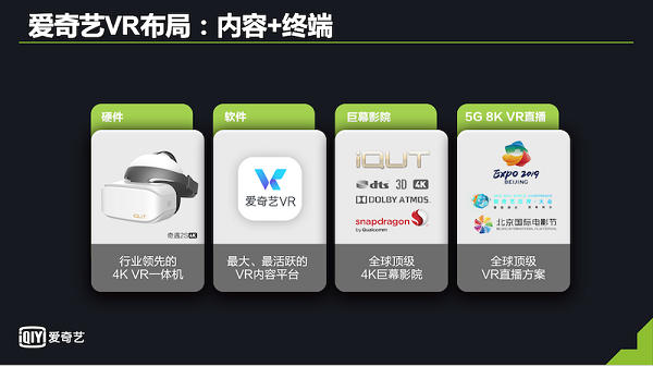 面對(duì)5G,愛(ài)奇藝將會(huì)從點(diǎn)播、直播、游戲、AI、VR、采編幾個(gè)方向持續(xù)關(guān)注技術(shù)及產(chǎn)品升級(jí)。這里重點(diǎn)介紹下愛(ài)奇藝在VR領(lǐng)域的布局,愛(ài)奇藝從戰(zhàn)略上非常看好VR市場(chǎng)的發(fā)展。早在2015、2016年,愛(ài)奇藝就開始在內(nèi)容和終端兩個(gè)維度同時(shí)對(duì)VR進(jìn)行戰(zhàn)略性投入,盡管這幾年市場(chǎng)有所起伏,但是愛(ài)奇藝一直在VR領(lǐng)域持續(xù)進(jìn)行投資。
