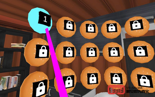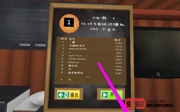 看完了教程,選擇任務(也就是單人模式),在這里我看到一大堆關卡在等著我。游戲采用類似《憤怒的小鳥》的模式,玩家需要在每一個關卡中完成相應的任務,然后才能解鎖后面的關卡。這種多關卡多任務的方式非常適合移動VR游戲,原因也很簡單,每一個關卡的內容加載量不大,便于一體機設備順暢運行。在這款游戲中,每一個關卡的任務不僅在開頭明確顯示出來,而且還顯示了玩家得分排行榜,這樣的設計顯然是鼓勵不同玩家之間的競爭,喜歡拿高分的玩家肯定十分喜歡。