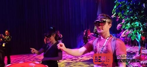 戴上微軟HoloLens眼鏡,走進這個空間,立即看到熱帶植物的色彩繽紛的景象。在這些道具上疊加了各種野生動物的AR影像。通過引導,我們注意到這些生物正在傳達一些藝術(shù)家的想法。