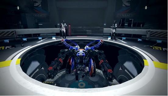 通過《Rigs》簡短的視頻演示,你不難發(fā)現(xiàn)它的兩個顯著特色:高速移動和鮮明的配色。首先,機甲使用了容易分辨的藍、紅、綠等色調(diào)搭配金屬色,讓玩家能夠輕松分辨出敵我;而以賽道平臺為主的競技場空間,則使用了顏色進行區(qū)域劃分。比如,游戲機制是跳入黃色圓環(huán)占點得分,那么屏幕上的指示便是黃色,其賽道、圓環(huán)本身也是黃色,玩家需要盡快趕到黃色區(qū)域,同時摧毀阻礙道路的敵人獲得得分,這種設計相對來說是容易理解的。