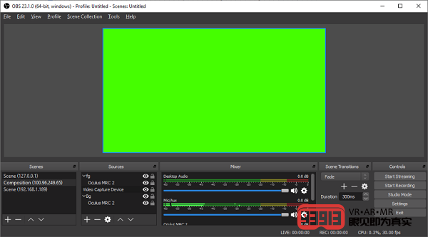 啟動(dòng)Oculus Quest上的混合現(xiàn)實(shí)捕獲應(yīng)用程序,并使用新的Oculus混合現(xiàn)實(shí)插件合成OBS(一個(gè)免費(fèi)和開(kāi)源的跨平臺(tái)流媒體和錄制程序)中的鏡頭。