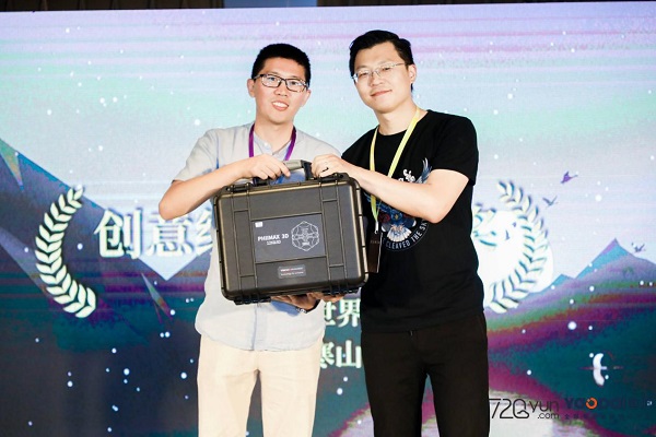 年度大賽最佳全景視頻獎(jiǎng)獲獎(jiǎng)?wù)邉⒈蛳壬ㄗ笠唬┌l(fā)表了獲獎(jiǎng)感言,感謝大賽設(shè)立全景視頻獎(jiǎng)項(xiàng),希望可以在2019年創(chuàng)造出更好的VR視頻作品。年度大賽VR設(shè)備贊助伙伴代表沈陽泰科易科技有限公司商務(wù)總監(jiān)陳偉鵬先生(右一)發(fā)表了對(duì)年度大賽的祝福,同時(shí)將大賽獎(jiǎng)品泰科易PHIIMAX3D全景相機(jī)頒發(fā)給獲獎(jiǎng)?wù)摺?/div>