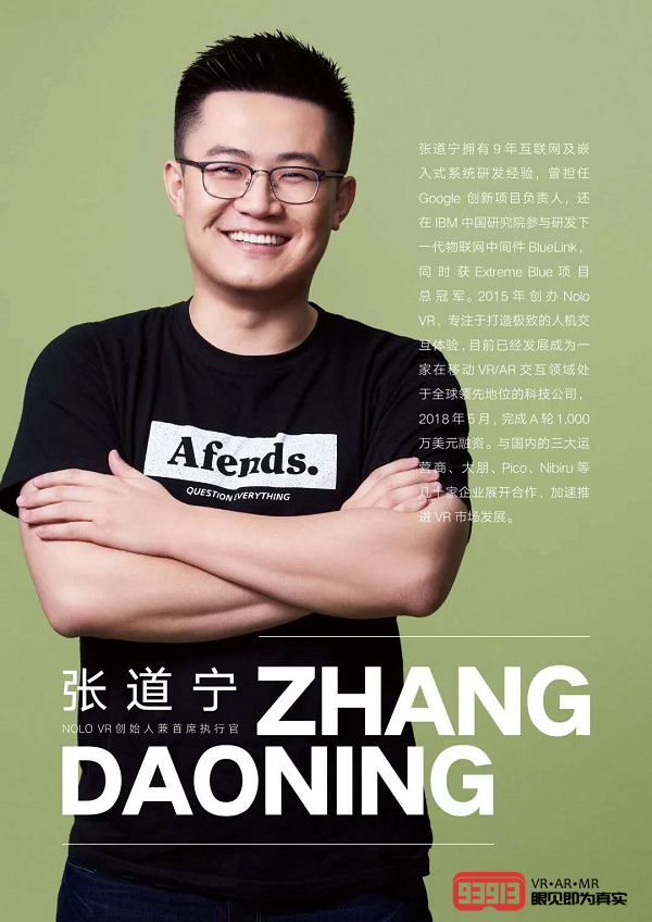 張道寧于2015年創(chuàng)辦NOLO VR,專注研發(fā)VR定位交互技術(shù)。經(jīng)過兩年的技術(shù)積累,2017年,在Kickstarter推出了基于安卓手機(jī)的爆款6DoF VR交互設(shè)備NOLO CV1,獲得了來自全球范圍內(nèi)66個國家用戶的支持。2018年,張道寧入選福布斯中國“30位30歲以下精英”。同年,NOLO VR與百度、騰訊、阿里巴巴、字節(jié)跳動等企業(yè)共同入選“雙創(chuàng)周”2018年顛覆性創(chuàng)新榜,成為國內(nèi)第一批帶有顛覆性創(chuàng)新標(biāo)簽的企業(yè)。2019年1月,張道寧成為由清華大學(xué)、騰訊共同創(chuàng)辦的青騰大學(xué)史上最年輕CEO。2019年3月,他從亞洲各國數(shù)千名競爭者中脫穎而出,入選福布斯亞洲“30位30歲以下精英”。