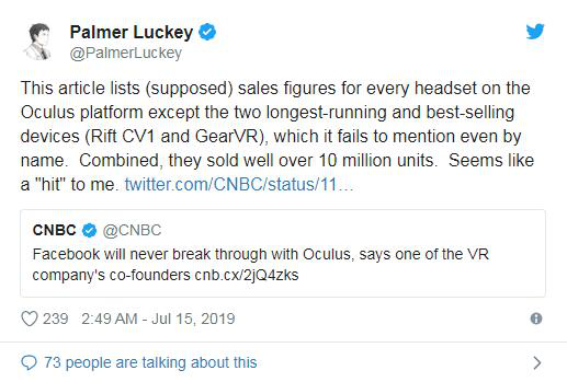 前Oculus聯(lián)合創(chuàng)始人Palmer Luckey在Twitter上說,Gear VR和Oculus Rift CV1的捆綁銷售超過了1000萬臺(tái),這意味著Oculus的銷售額超過了以上數(shù)字。