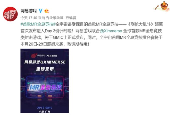 23日,網(wǎng)易游戲在官方微博發(fā)布消息,稱將在7月25-28日舉行的2019年全球移動(dòng)互聯(lián)網(wǎng)大會(huì)(簡稱:GMIC)上推出全球首款MR全息競技游戲——剛槍大亂斗(Blaster)。