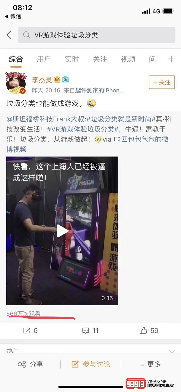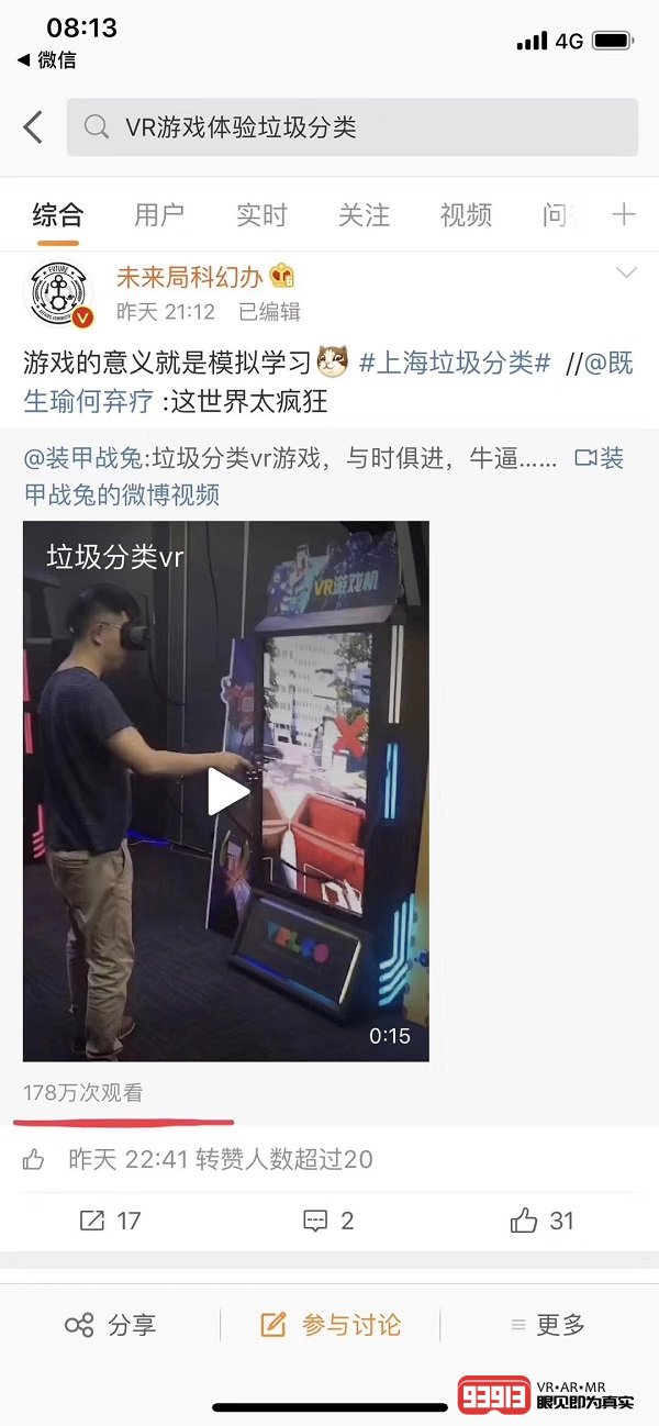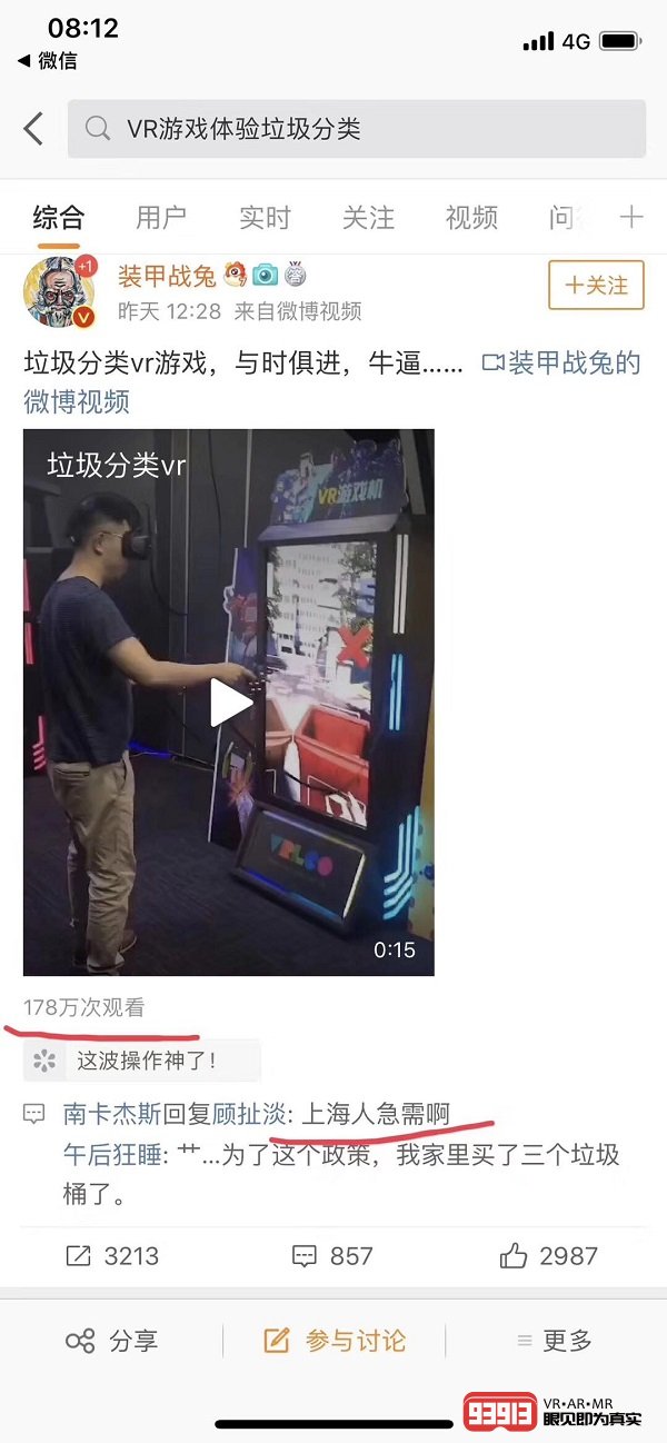 搜索VR(虛擬現(xiàn)實(shí)),我們發(fā)現(xiàn)VR游戲體驗(yàn)垃圾分類都登上了微信和微博熱點(diǎn),VR的沉浸式感可以讓人全身心地投入其中,身臨其境的現(xiàn)場(chǎng)還原能讓人們?nèi)褙炞⒌伢w驗(yàn),而游戲模式無(wú)疑是最容易理解的垃圾分類解決方案。