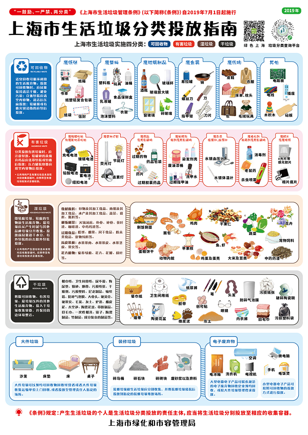7月1日,有著“史上最嚴(yán)”稱號(hào)的垃圾分類管理辦法:《上海市生活垃圾管理?xiàng)l例》正式實(shí)施,據(jù)悉,該條例將垃圾主要分為了可回收物、有害垃圾、濕垃圾和干垃圾這四種,未能正確分類投放垃圾的,單位可處五千元以上五萬(wàn)元以下罰款,個(gè)人可處五十元以上二百元以下的罰款。