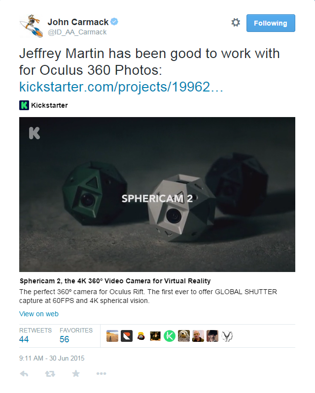 Jeffrey Martin在 2012 年的時候已經(jīng)在 Kickstarter 上進行了 Sphericam 1代的眾籌,最后以約三萬五千美金的金額超過原定計劃(一萬)三倍多的成績達成了目標(biāo)。而在三年后的今天,他帶著Sphericam 2再次開啟了眾籌之旅,這次的目標(biāo)直指15萬美金,然而上線兩天已然超過了50%,且被 Oculus 的 CTO John Carmack 所推薦。