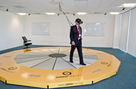 該實(shí)驗(yàn)室配備了一個(gè)帶有Oculus Rift DK2虛擬現(xiàn)實(shí)頭盔的全向行走儀,這個(gè)行走儀直徑6米,足夠一個(gè)人在上面自由走動(dòng),為了將VR的浸入式效果發(fā)揮到極致,TSC在實(shí)驗(yàn)室里部署了多套不同的系統(tǒng),如Omnifinity Omnideck 6。
