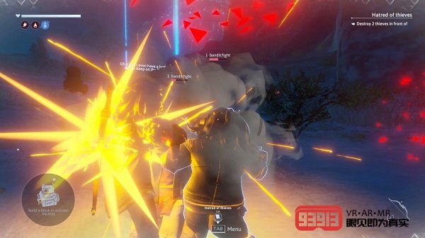 在戰(zhàn)斗方面,《Nostos》VR版的戰(zhàn)斗是“全身運(yùn)動”,完全不像非VR模式只是動動手指就可以,這樣的好處則是更真實(shí)和更具沉浸感。首先是弓箭的軌跡會隨著距離而彎曲,即射向遠(yuǎn)方的箭會飛出一道弧線,這點(diǎn)非常真實(shí);其次是弓箭射擊帶有爆頭的設(shè)定,射中敵人頭部會有特效顯示,同時中箭的敵人身上也會顯示這些箭枝,看起來又真實(shí)又有趣。這種緊張刺激也是PC版無法比擬的。