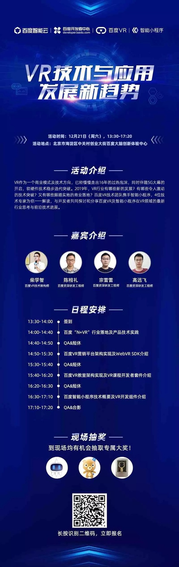 百度VR技術(shù)團隊攜手智能小程序,4位技術(shù)專家為你一一解讀,與開發(fā)者共同探討和分享百度VR及智能小程序在VR領(lǐng)域的最新行業(yè)思考與前沿技術(shù)進展。