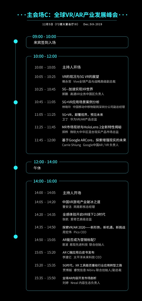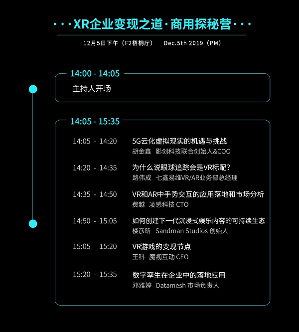 5G、VR、AR作為大會(huì)上主要版塊之一,會(huì)上設(shè)立了“全球VR/AR產(chǎn)業(yè)發(fā)展峰會(huì)”主論壇、“變現(xiàn) · 商業(yè)模式探秘營”分論壇,以及“XR進(jìn)化論 · 2019新品VR/AR硬件展”。 論壇上將有二十位重磅嘉賓參與演講,分享干貨內(nèi)容,在5G大潮來臨時(shí),從市場現(xiàn)狀出發(fā),深度探討新一年乃至接下來5-10年的產(chǎn)業(yè)發(fā)展機(jī)會(huì)與路徑。大會(huì)探討內(nèi)容包括硬件形態(tài)、技術(shù)趨勢、落地變現(xiàn)、行業(yè)機(jī)會(huì)等等,一切與從業(yè)者切身相關(guān)的話題。