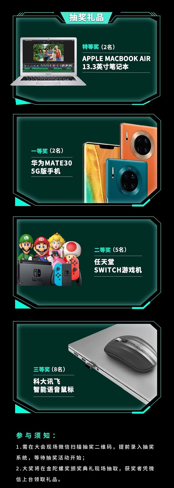 抽獎(jiǎng)環(huán)節(jié)同樣不容錯(cuò)過,本屆大會(huì)設(shè)置四重豪禮——蘋果Macbook Air、華為Mate 30 5G版手機(jī)、任天堂Switch游戲機(jī)、科大訊飛智能語音鼠標(biāo),完成簽到即可參與。